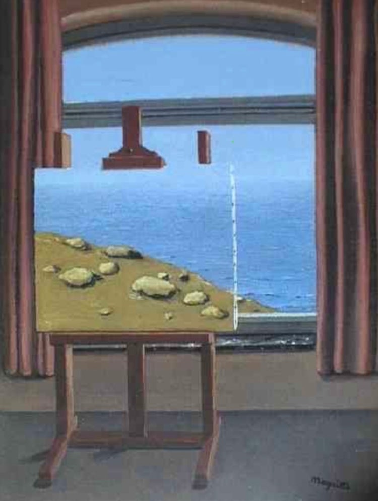 초현실주의를 대표하는 작품 중 하나로, 1933년에 그려졌습니다. 이 작품은 마그리트가 초현실주의적 기법을 통해 현실과 상상의 경계를 허물고, 인간 존재의 본질과 한계를 탐구하는 작품입니다. 두 가지 현실을 동시에 보여주는 독특한 구성을 가지고 있습니다. 그림 안에서 캔버스가 창문으로 보이고, 창문 뒤에는 또 다른 그림이 나타나는 형식입니다. 이 그림의 핵심은 보이는 것과 보이지 않는 것의 관계를 묘사하는 데 있습니다. 창문을 통해 보여지는 풍경은 그림 속의 그림이지만, 창문 앞에 놓인 캔버스도 실제로 그려진 그림입니다. 이렇게 두 개의 세계가 동시에 존재하는 듯한 착시 효과를 만들어냅니다. 이 작품은 우리가 현실을 어떻게 인식하고 해석하는지, 그리고 인간의 존재와 인식에 대한 질문을 제기합니다. 마그리트는 우리가 보는 것, 믿는 것, 그리고 그것이 사실인지 아닌지를 불확실하게 만들며, 인간의 인식이 어떻게 제한적인지를 드러냅니다. 예술을 통해 현실의 본질에 대한 탐구를 하는 대표적인 예입니다.. 미술 역사에 대해 공부하시다보면 자주 접하게 되시는 작품입니다..
