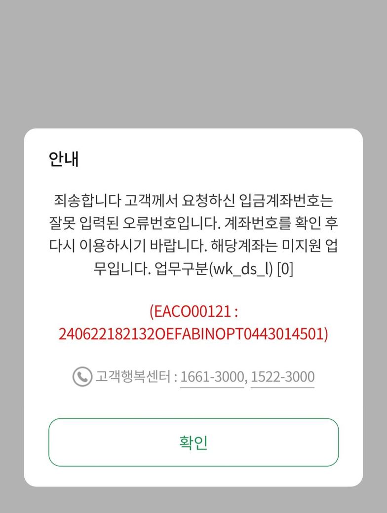위와 같은 경우에는 잘못된 계좌번호를 입력하신 것으로 보입니다. 그렇기에 계속된 오류가 뜨는 것으로 보이니 참고하시길 바랍니다.