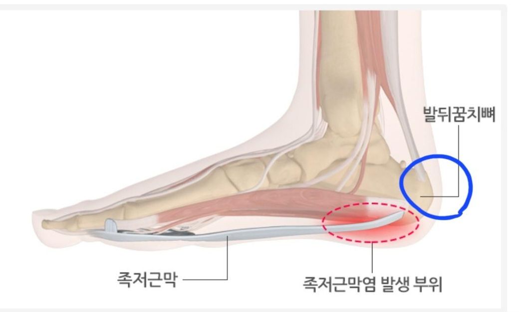 표시된 부분의 통증의 원인은 족저근막염이나 아킬레스건염 일 수도 있을 것 같습니다.