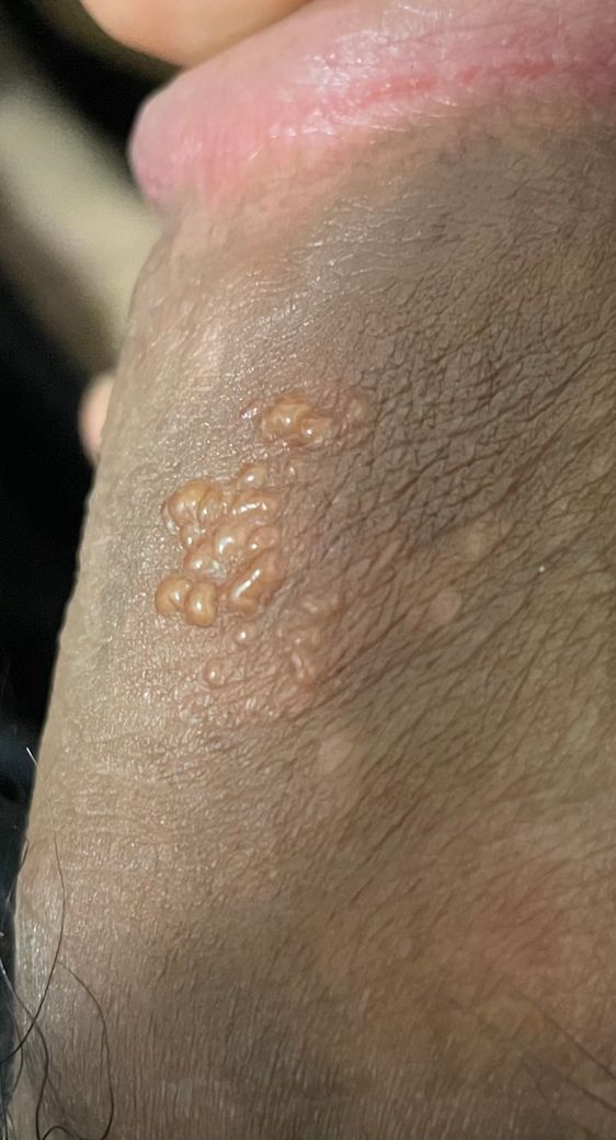 수포성 병변이 군집을 이루고 있어 헤르페스에 대한 확인이 필요할 것이라 생각되고, 비뇨의학과를 방문하시기를 권해드립니다.