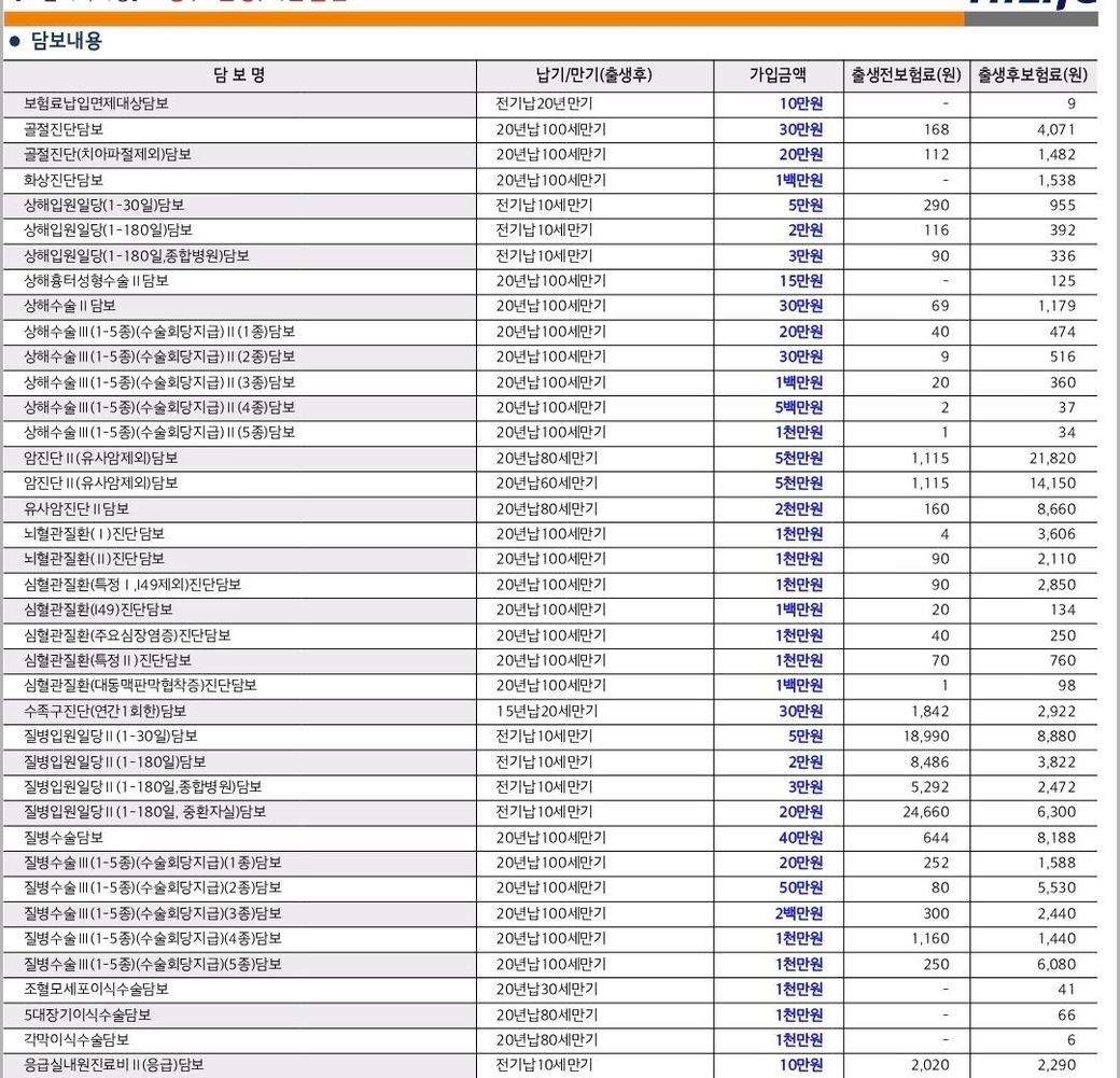 따로 크게 중복되어있는부분도 없구요. 다만 신생아때 많이 준비하시는 선천질환에 관한 특약들은 따로 보이지 않습니다.