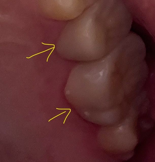 크라운 완전 접착하고왔는데 사진에 화살표해둔 2개 한거거든요. 작은이는 괜찮은데 큰어금니쪽에 혀로 훑으면 까끌거리길래 사진찍어봤더니 저렇게 흰색 조각같은게 묻어있는데 접착제 맞을까요?? 접착제가 맞다면 시간 지나면 알아서 떨어지나요 치과가서 제거해야하나요