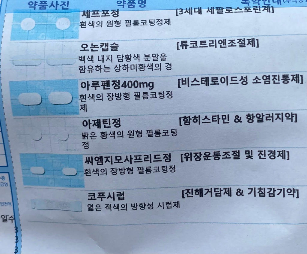 겹치는 약인 이비인후과약의 이루펜정과 씨엠지모사프리드정을 제외하고는 나머지 약은 함께 복용을 하셔도 됩니다. 복용시 위장에 자극감을 줄이기 위해 식후에 복용을 권장드립니다.