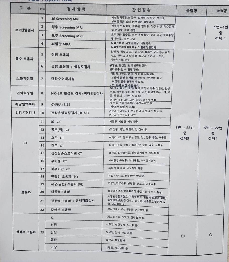 개인적으로는 MR 선별검사 항목에서는 MR형에서 뇌혈관MRI나 뇌 screening MRI를 받아볼 것 같습니다.