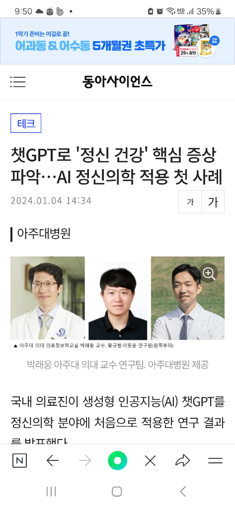 아주대학교병원 정신건강의학과가 챗 GPT(ChatGPT)를 정신의학 분야에 적용한 연구결과를 발표했다는 정보가 있습니다. 이는 챗 GPT가 인공지능(AI) 기반의 챗봇 서비스로, 대용량 데이터 학습을 통해 인간처럼 종합적으로 추론하고 대화 형식으로 쉽게 사용할 수 있다는 점에서 주목받고 있습니다 . 하지만, 이 정보는 챗 GPT를 실제 진료에 사용한다는 의미가 아니라, 정신건강 분야에서의 챗 GPT의 적용 가능성에 대한 연구를 의미합니다. 따라서, 아주대학교병원이 챗 GPT를 사용하는 정신과 진료 병원이라는 표현은 연구와 기술 적용의 가능성에 대한 것이지, 환자 진료에 직접적으로 챗 GPT를 사용한다는 의미는 아닙니다
