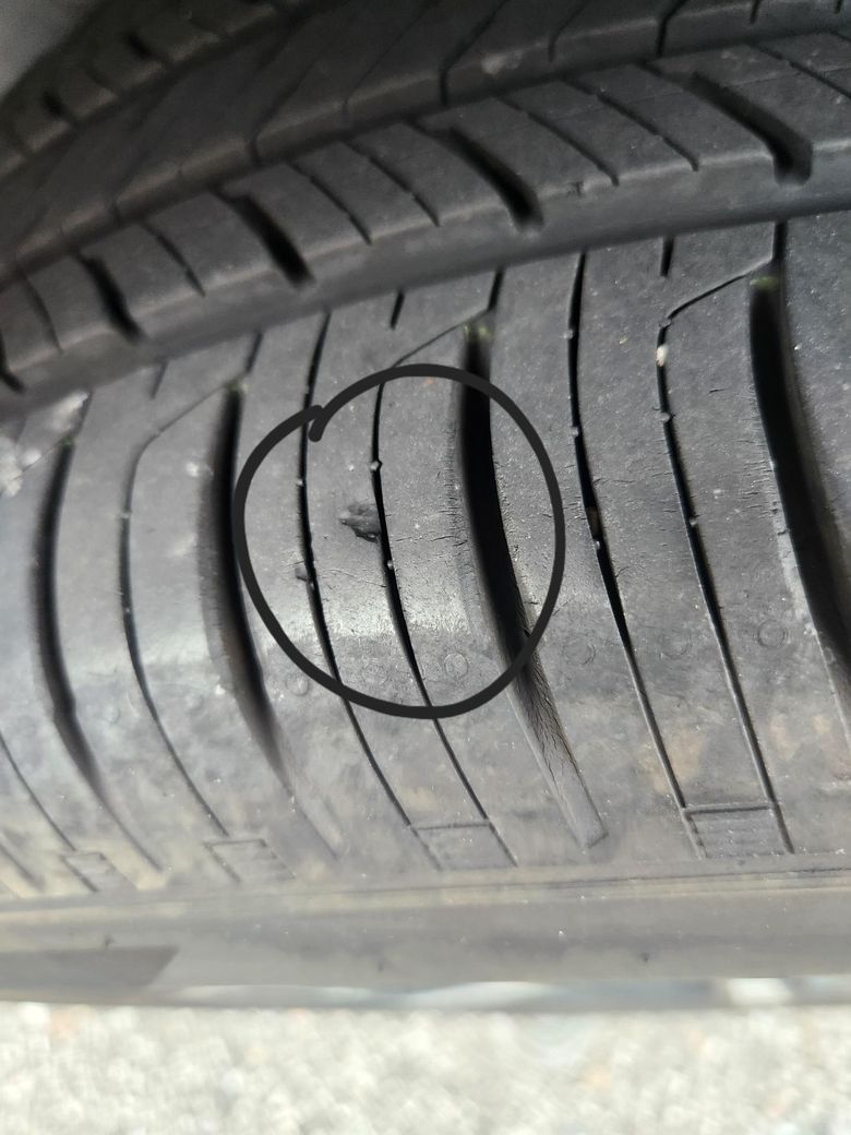 사진으로 보면 표시된 부분은 타이어 표면 고무가 살짝 뜯기거나 이물질이 박힌 흔적으로 보입니다. 하지만 정확한 상태는 공기 누출 여부와 손상 깊이에 따라 달라집니다. 따라서 비눗물을 묻혀 기포가 생기는지 확인하고 공기가 새면 즉시 교체하세요. 손톱으로 눌러봤을 때 단순 표면 긁힘이면 주행 가능하나 금속심(와이어)노출 시 즉시 교체해야 합니다.