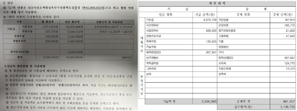 연봉 계약서,월 급여 명세서 공제액 맞나요?