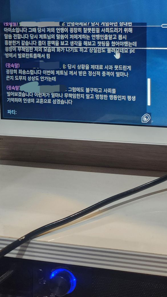 그래서 저가 그 논리가 된다면 저가한 말도 상대방의 캐릭터성 이라며 반박하자 상대방이 너가 한 말은 성립이 안된다며 저를 몰아갔습니다 저가 무슨 말 만 하면 협박죄라며 말을 못하게하다 결국 게임이 끝나고 다음날 저는 상대방쪽에게 사과문(저가 상대방의 말을 이해못했다는점) 쓰고