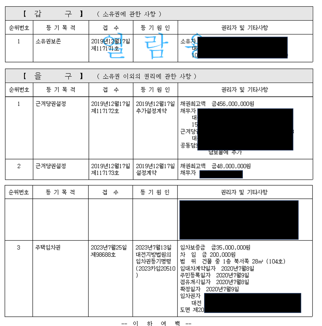 빌라에서 전세로 살고 있는데, 요즘 전세사기가 워낙 흉흉하다보니 한번 등기부 등본을 떼보았는데