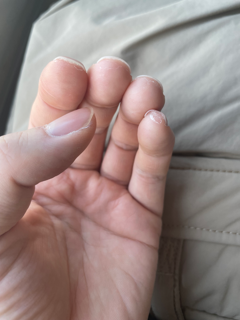 이러한 증상이 나타나는 경우, 박탈성각질융해증이 의심됩니다. 이 질환은 손과 발의 바닥이 비염증적으로 벗겨지는 만성적인 상태를 뜻합니다. 초기에는 작은 점 형태로 발생하다가 시간이 지나면 원형으로 껍질이 벗겨집니다. 이때 병변은 갈라져서 피부 위에 나타납니다.