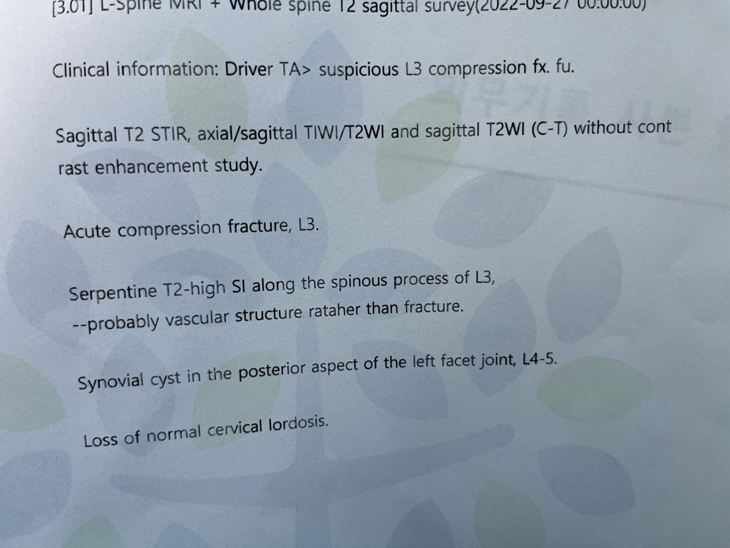 L3 급성 압박 골절, 활액낭종 L4-5, 일자목 이라고 적혀있습니다.
