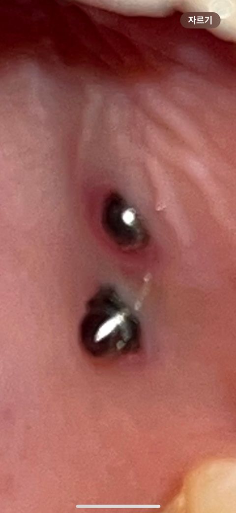 원래 두개가 튀어나와있었는데 오늘보니 하나가 저렇게 돼있어요 아픈건 하나도 없는데 염증인가요?.. 밥먹고 바로 찍은거긴 한데 붓기인지.. 스크류가 더 박힐수도 있는건가요