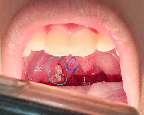 사진의 소견을 통해서 보았을 때에 해당 병변이 생긴 부위는 후두가 아니고 편도 쪽입니다. 편도의 결석이나 염증 및 그로 인한 산출물 등의 가능성이 높아 보입니다. 정확한 감별 진단 및 치료를 위해서는 이비인후과 진료를 받으시길 권고 드립니다.