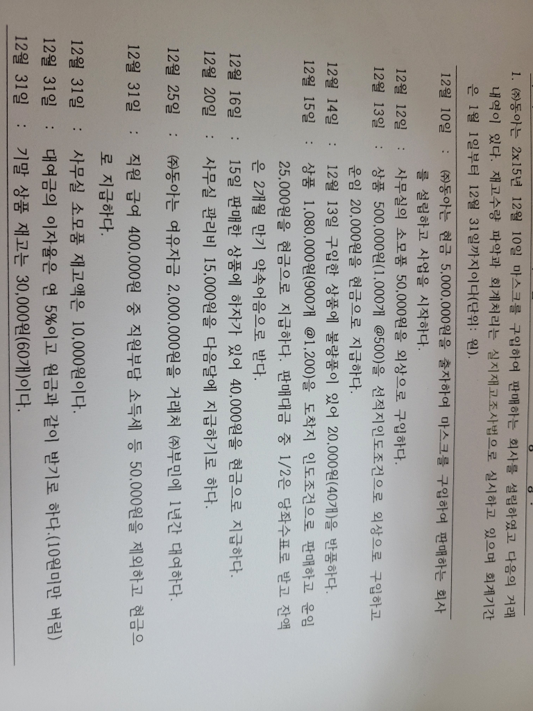 1) (차변) 급여 400,00원 (대변) 현금 350,000원, 소득세 등 예수금 50,000원