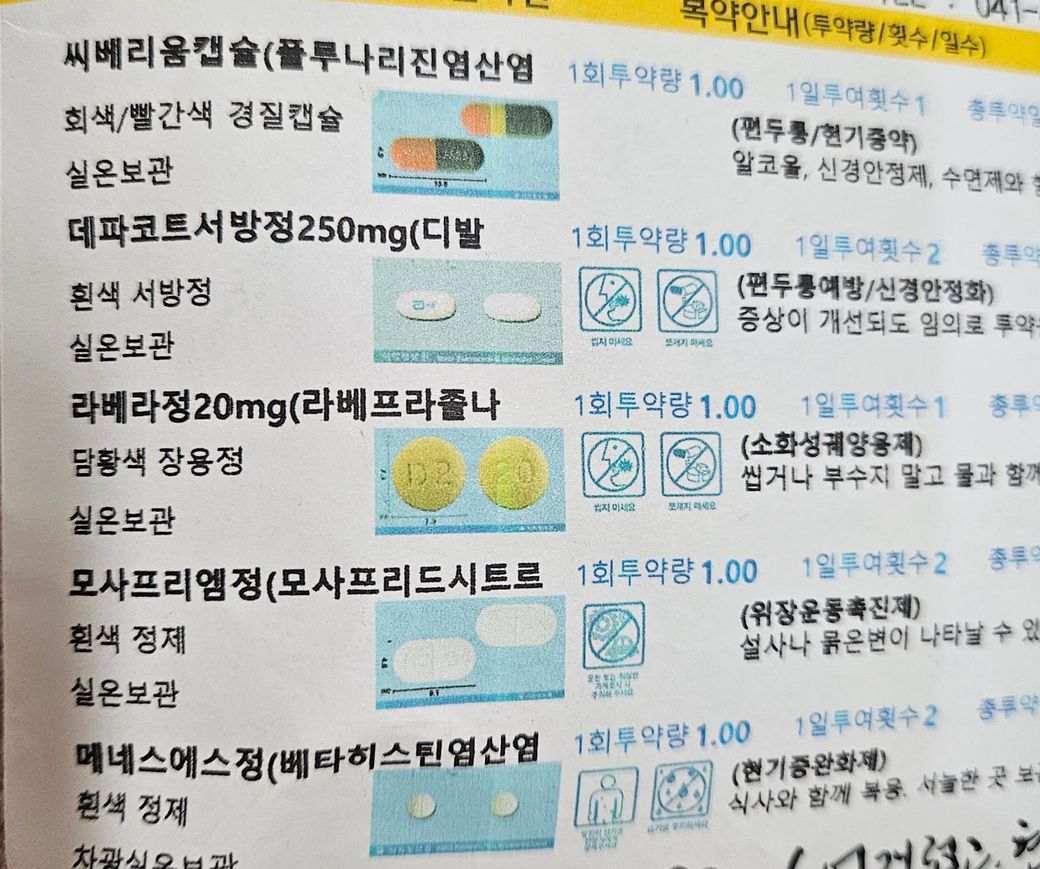 아래 두가지첨부약들(두통현기증).구내염처방약들 이렇게 같이 먹어도 중복되는거 있을까여? 시간차두고 같이 먹어도 될까여?