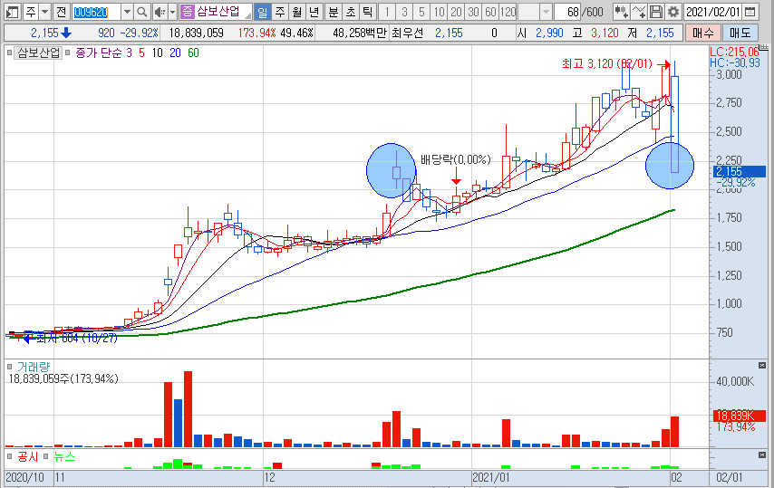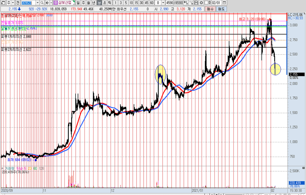 앞 부분의 동그라미는 상한가를 진입했었던 캔들이고