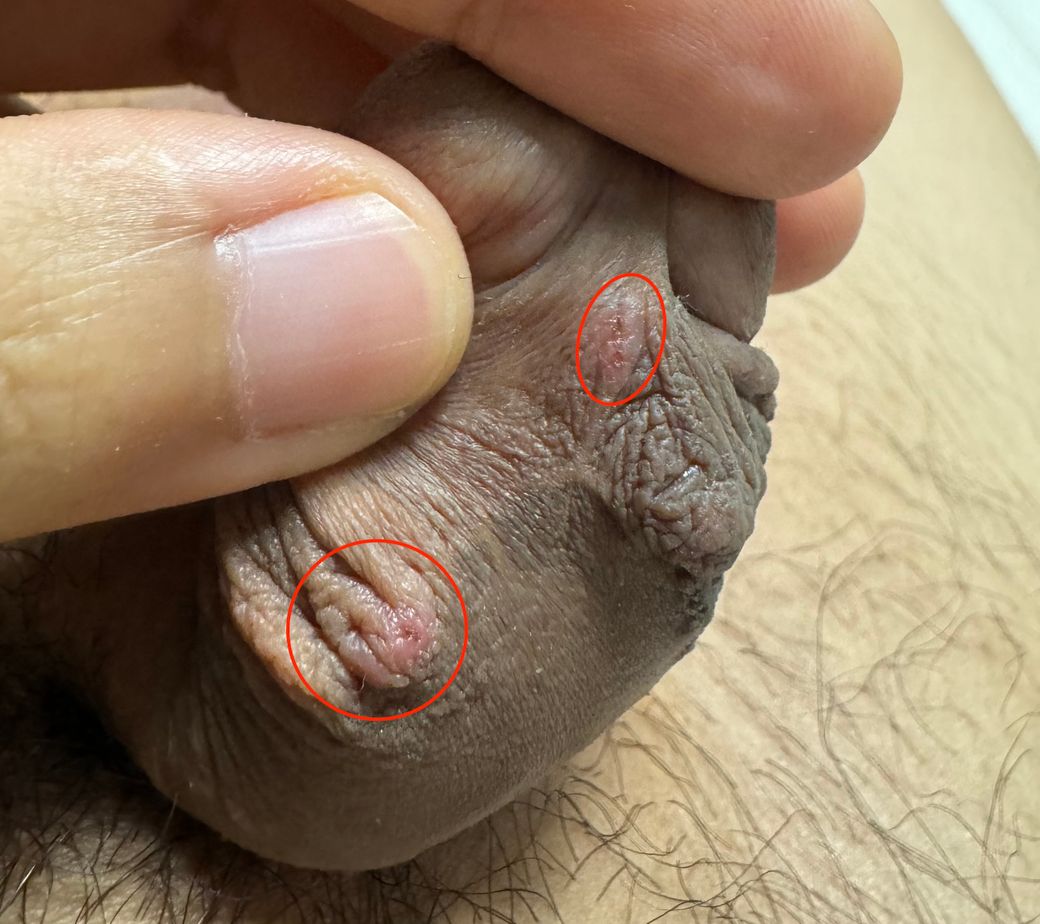 성기쪽을 살펴보니 작은 딱지가 생겨있고, 그 부위 주변으로 살짝 빨갛게 부어올랐네요.