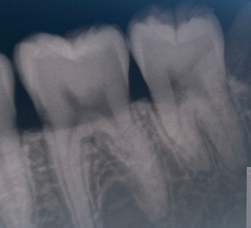 현재 주어진 방사선 사진만으로는 가장 안쪽 치아는 인접면 충치는 없고 교합면(씹는면) 충치가 있을 순 있는 것으로 판단됩니다. 아직 증상이 느껴질 정도 또는 신경까지 근접한 심한 충치는 없습니다