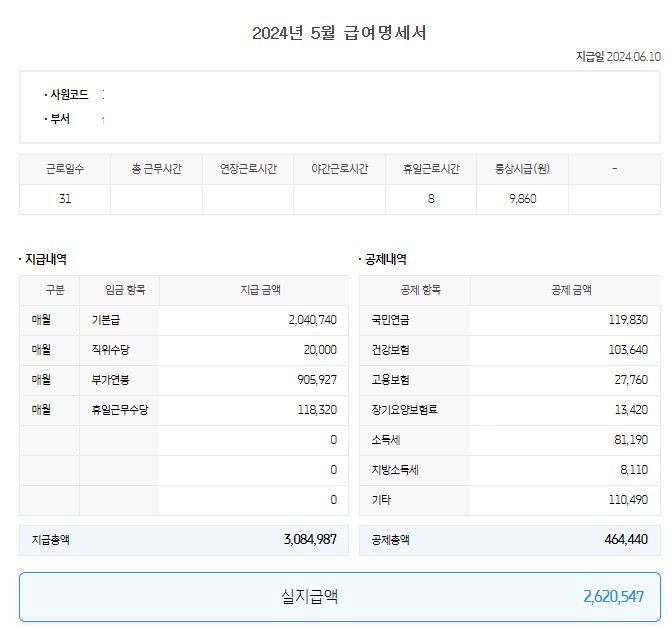 저는 오버타임은 하지않고 (사무직)늘 똑같은 금액으로 급여명세서를 받아왔습니다