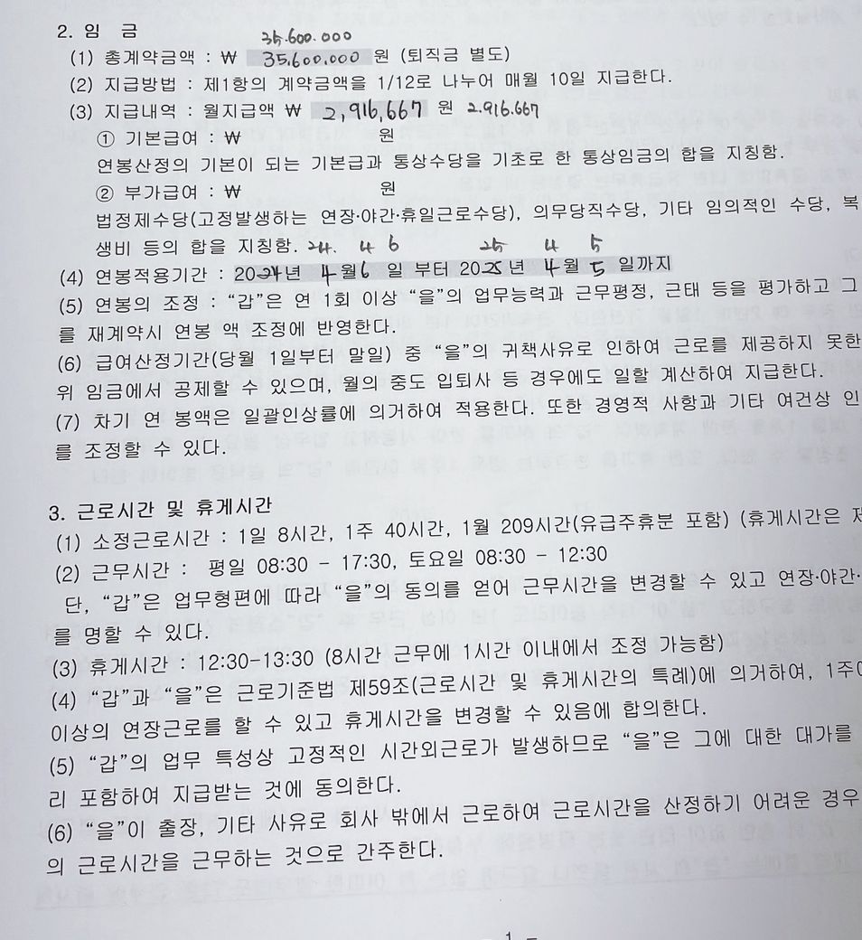 근로계약서 아래에 붙임과 같이 지급내역은 월지급액으로만 근로계약서를 작성하였으며,
