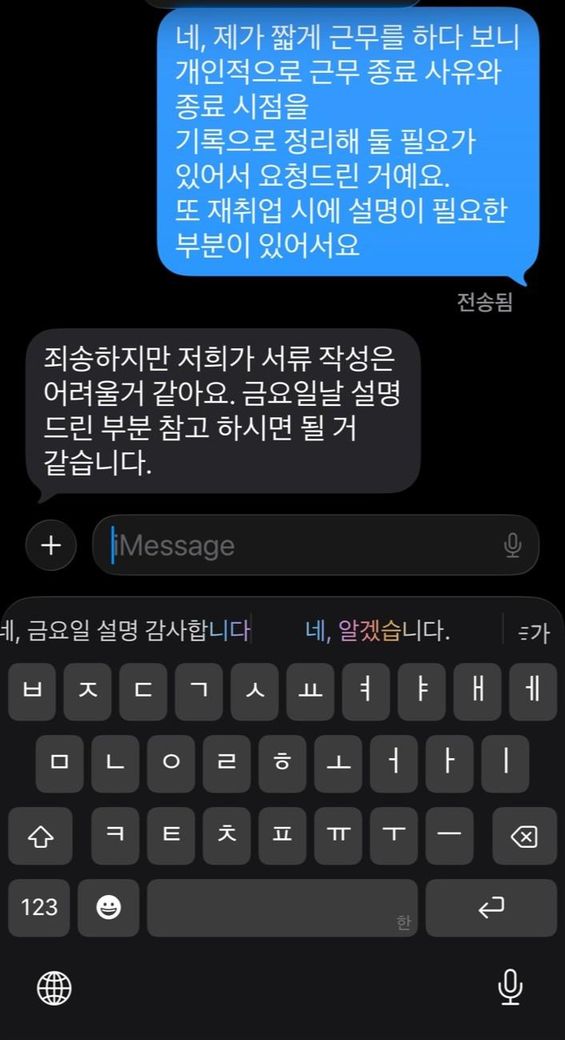 (회사 측에서는 서류 작성이 어렵다고 했고 , 금요일 날 구두로 설명드린 부분을 참고하라고 했습니다.)