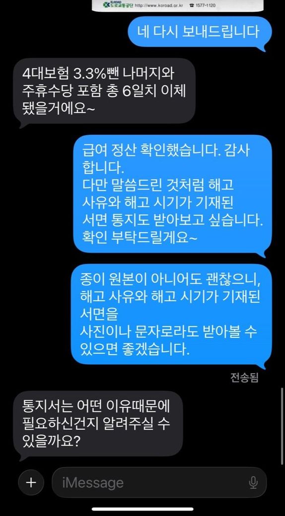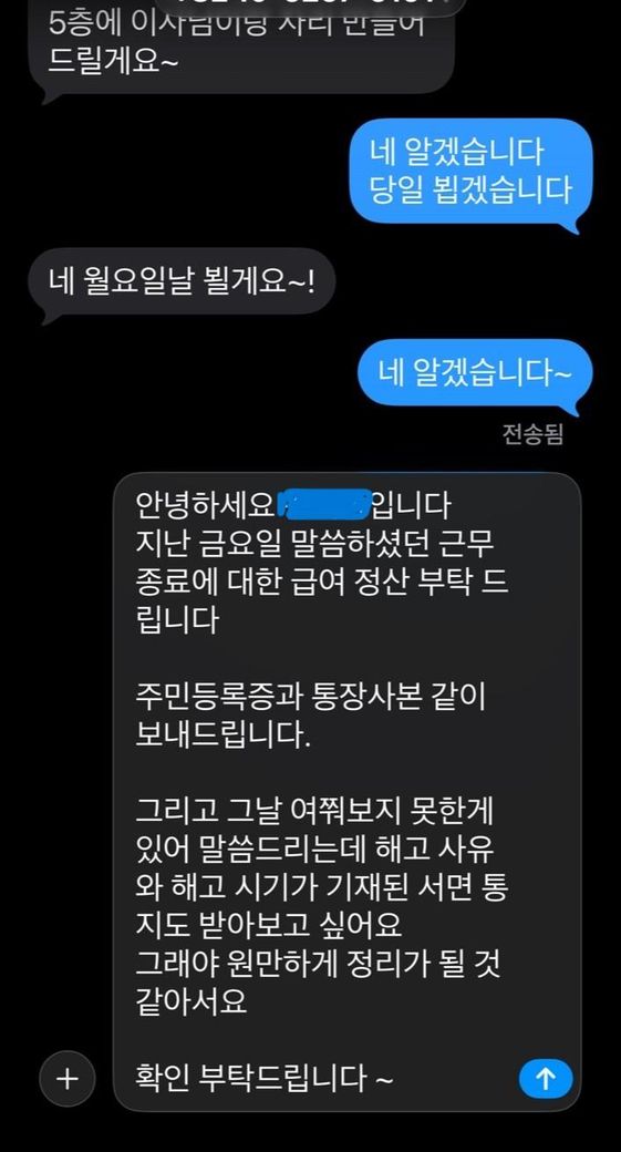 그리고 주말동안 생각을 정리하면서 여태까지 일했던 근무 급여를 받았지만 해고 사유와 시기가 기재된 서면 통지를 받지는 못했습니다