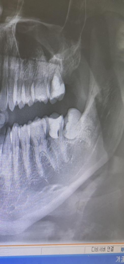 아래 신경치료한 어금니 앞의 어금니(제1대구치)는 지금 엑스레이 사진 가지고는 단정지을 순 없지만 충치가 있을 가능성도 있습니다. 평소 사이로 음식물이 많이 끼거나 시리거나 했다면 충치일 확률이 높습니다