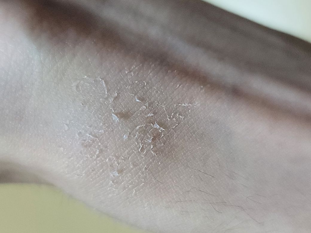 말씀하신 정보와 사진의 소견으로만 보았을 때에는 피부의 심한 질환의 가능성은 크게 높아 보이지 않으며 단순히 부분적인 건조함에 의해서 나타난 피부 각질로 보입니다. 우선은 충분히 보습을 해주면서 경과를 지켜보시길 권고드립니다. 만약 관리를 함에도 증상이 지속된다면 피부과에서 진료를 받아보시는 것이 좋겠습니다.