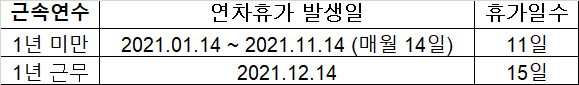 21년 12월 14일일이 되는 시점에 15개의 연차가 발생하게됩니다.