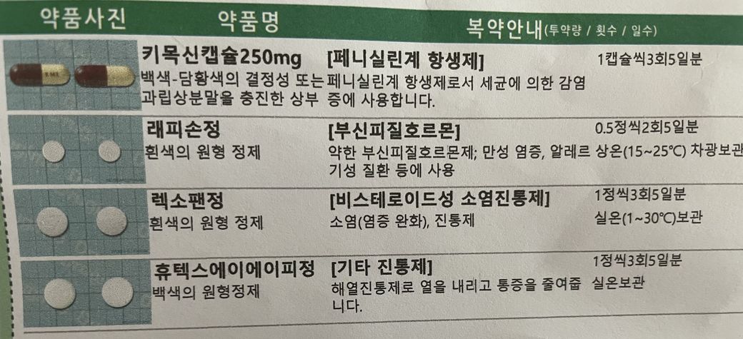 1. 문의주신 약에는 진통제/항생제/위보호제 정도 처방되어있습니다.