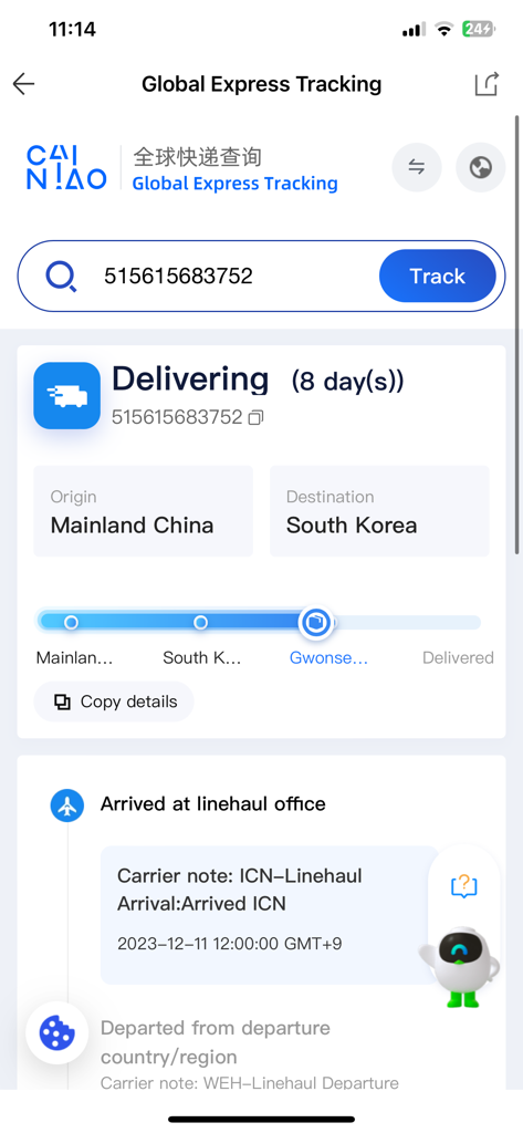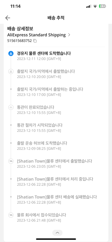 아무래도 연말에는 해외직구 건이 폭증하다보니 배송 예정일보다 늦는 경우가 다반사입니다. 알리에서 제공한 화면에서는 한국에 도착한 것으로 보여지는데 입항되었다면 관세청 유니패스 화물진행정보에 운송장 번호를 입력하면 확인이 가능합니다. 따라서, 조금 더 기다리면 물품이 수령될 것으로 에상되오니 참고하시기 바랍니다.