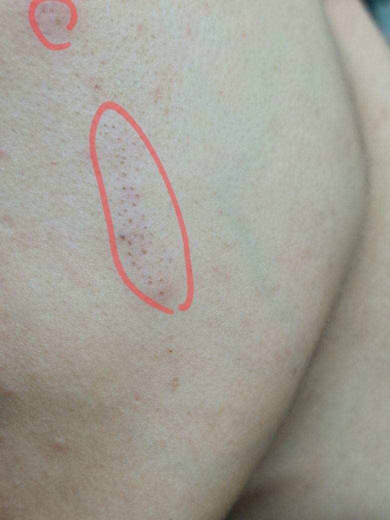 사진으로 명확하진 않지만 다발성 피지낭종의 가능성이 있습니다. 대학병원 피부과에서 보다 정확한 진단과 치료를 받는 것을 권유드립니다.