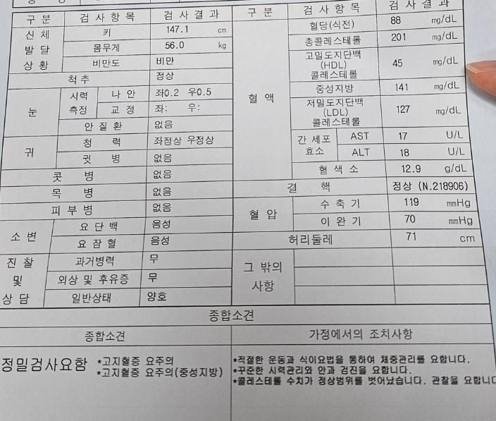콜레스테롤과 중성 지방이 약간 높게 나타났으나 약물 치료가 필요한