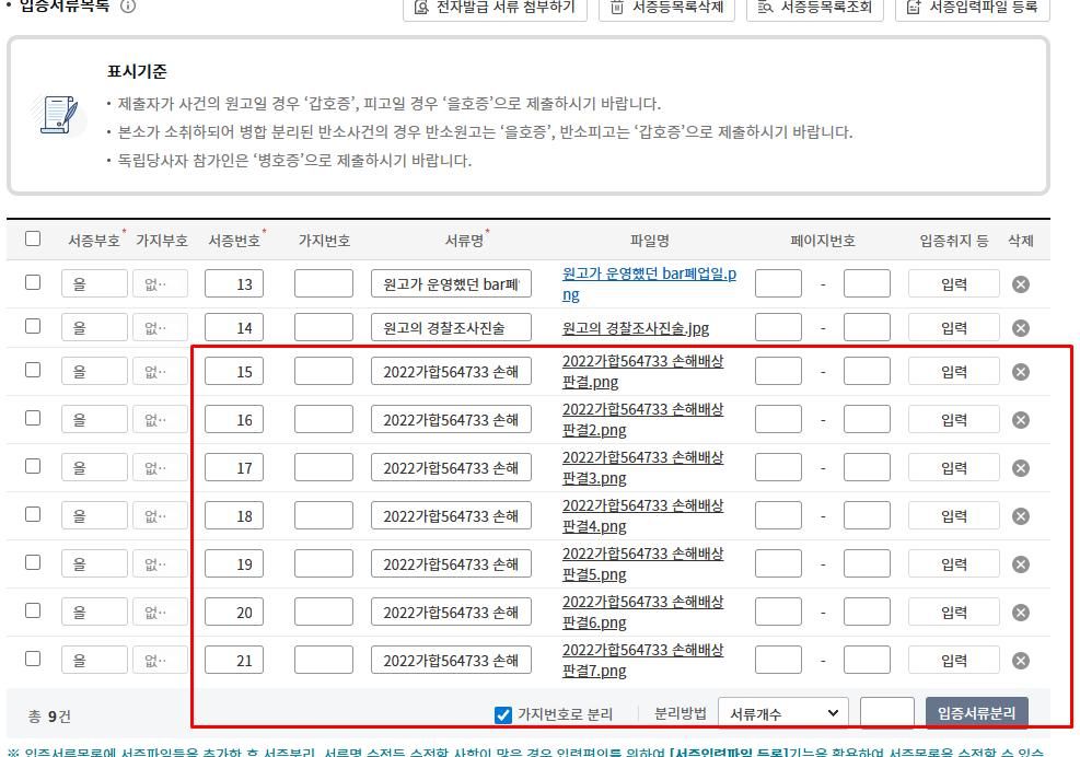저랑 매우 유사한사건 및 유리한 사건이라 이판결문을 전체내용을 첨부하고있거든요 이렇게 본문에 을15~21호증이라고 쓰고 입증서류에 저렇게 하나하나다등록하는거맞나요?;;