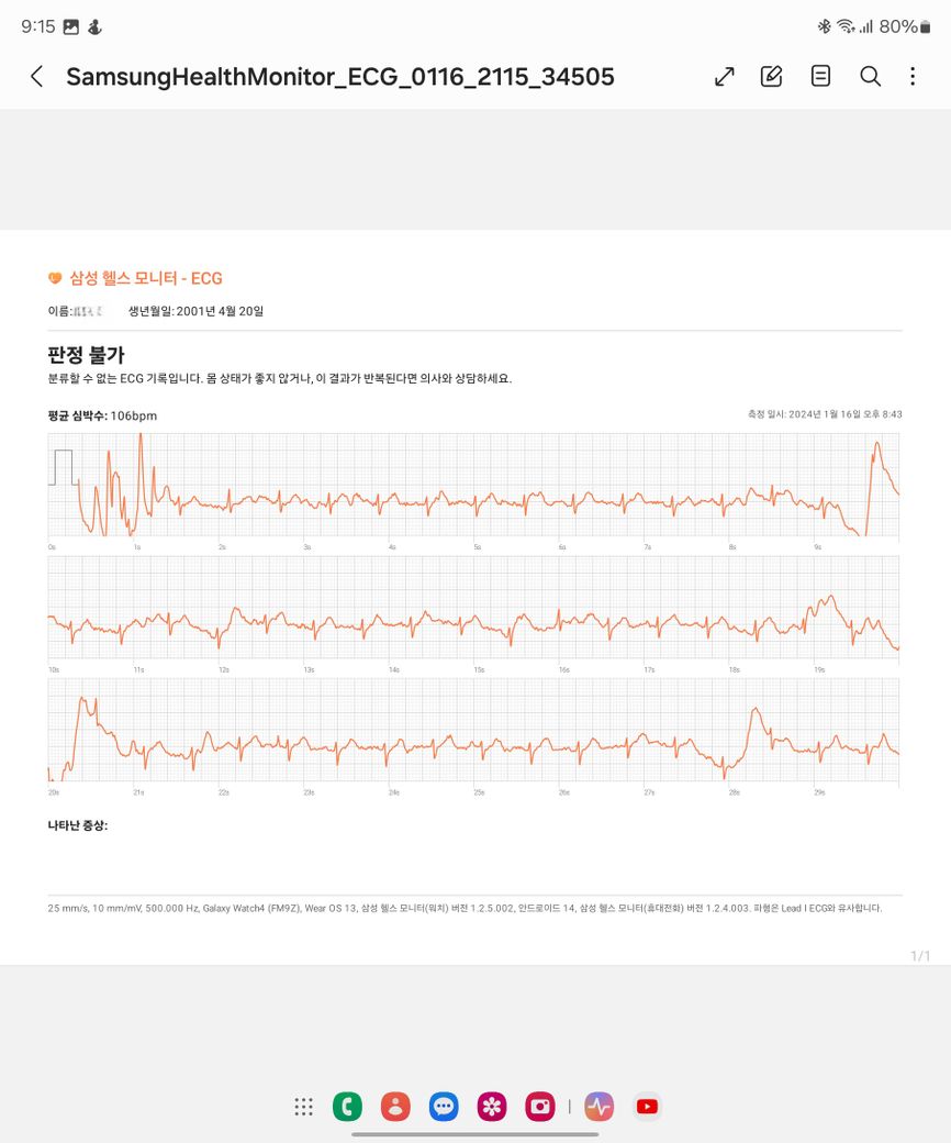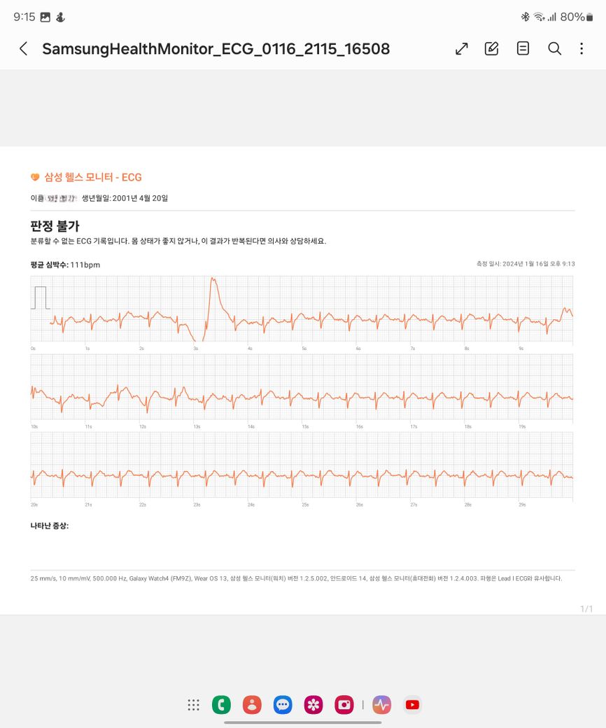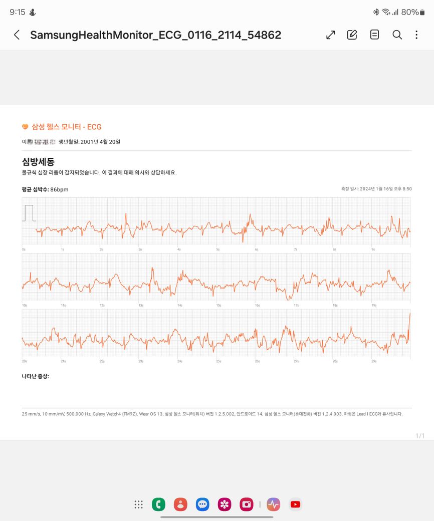 워치로 측정한 심전도는 큰 문제 없어보입니다. 동율동으로 보이며, 나머지는 측정 시 움직임으로 인한 노이즈 현상, 즉 측정이 잘못 된 것으로 보입니다.