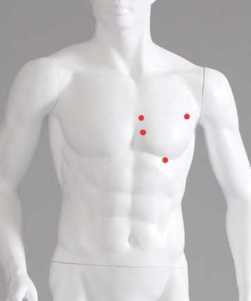 두 달 전부터 사진 상 왼쪽 가슴 빨간 점 부근에 불규칙적으로 5초 정도 찌르는 듯한 통증이 있습니다 흡연, 음주는 안합니다