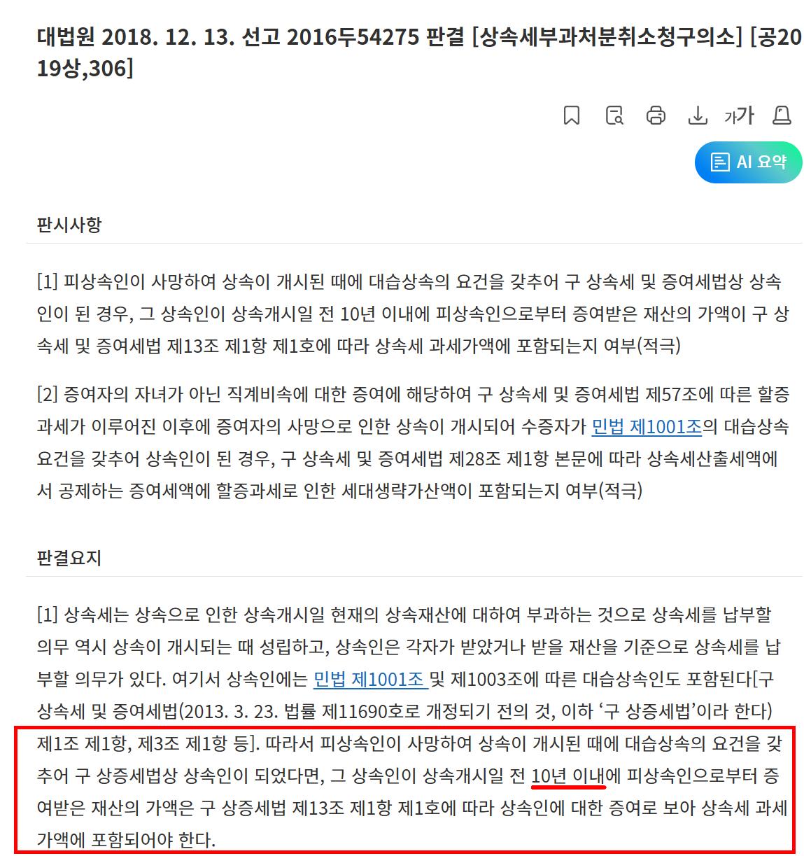 상속인은 민법에 따른 상속인을 의미하므로 며느리와 사위가 대습상속인이 된 경우라면 상속인이 되어 상속개시일 전 10년간 사전에 증여 받은 재산은 상속재산가액에 가산하게 되는 것입니다.