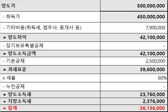 500,000,000 - 450,000,000 - 7,900,000 = 42,100,000(양도차익)