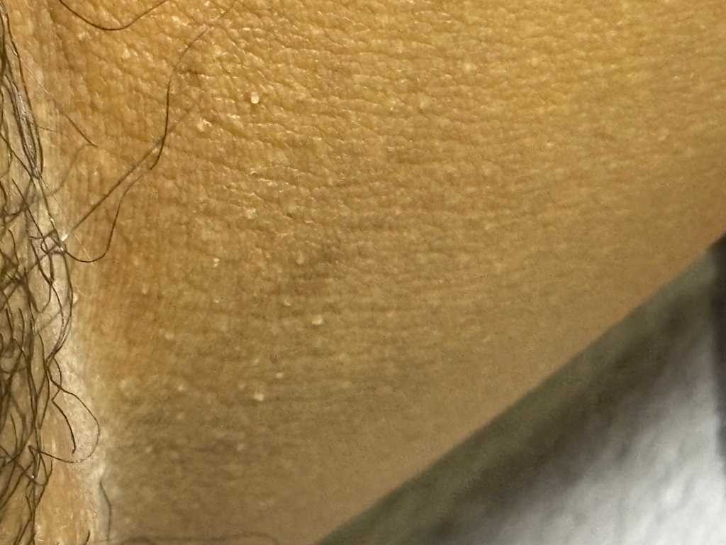 사타구니에 올라온건데 크기가 커지지는 않고 빛으로 비춰보면 여러개 잇습니다 모낭이 올라온것처럼 쥐젖마냥 떨어지진 않습니다.