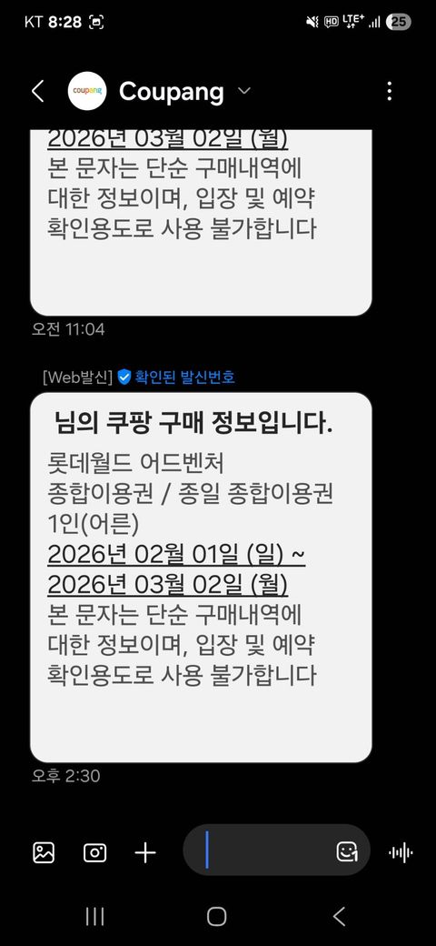 안녕하세요 쿠팡내에서 롯데월드 종일 종합이용권 티켓 구매한 사람입니다. 도대체가 어떻게 티켓을 확인하는지 모르겟어서 문의 드립니다. 보시다시피 사진에서 문자 발송 했는데 이선 아닌거 같네요. 도와주세요