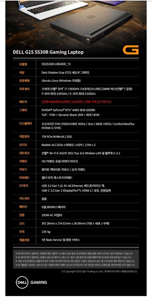 일단 보니까 SSD를 추가 장착 할 수 있는지에 대한 내용이 스펙에 없습니다. 물론 이정도 사이즈면 대부분 장착가능슬롯이 있기는 한데 한번 델측에 문의해보시기 바랍니다