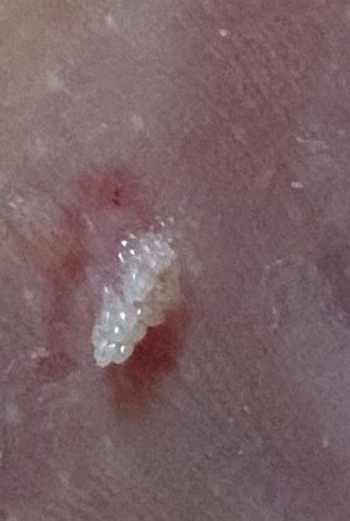 사진과 경과만 보면 전형적인 곤지름(HPV 사마귀) 소견과는 거리가 있어 보입니다. 곤지름은 보통 닭볏·콜리플라워처럼 표면이 건조하고 여러 개로 퍼지며, 갑자기 이틀 만에 생기는 경우는 드뭅니다. 현재 병변은 작고 국소적이며, 표면에 투명·백색 내용물이 보이는 점에서 모낭염, 피지선 낭종, 경미한 자극성 염증 가능성이 더 높아 보입니다. 헤르페스는 보통 통증이나 화끈거림이 동반되고 물집이 여러 개 생기는 경우가 많아 현재 모습과는 다소 차이가 있습니다.