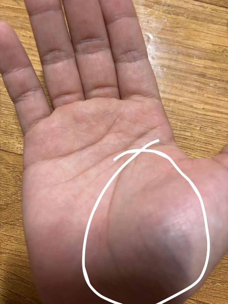 목발을 사용하면 손바닥 특히 엄지 아래 두툼한 부위(무지구, thenar eminence)에 체중이 반복적으로 실리기 때문에 초기 며칠 동안 통증이 생기는 경우가 비교적 흔합니다. 사진에서 표시된 부위 역시 목발 압력이 직접 전달되는 위치입니다. 목발 사용 초기에 손바닥 연부조직이 압박과 마찰을 반복적으로 받으면서 일종의 압박성 연부조직 통증이나 경미한 타박상 형태가 생길 수 있습니다. 이런 경우 양쪽 손에 비슷한 통증이 나타나는 것도 흔합니다.