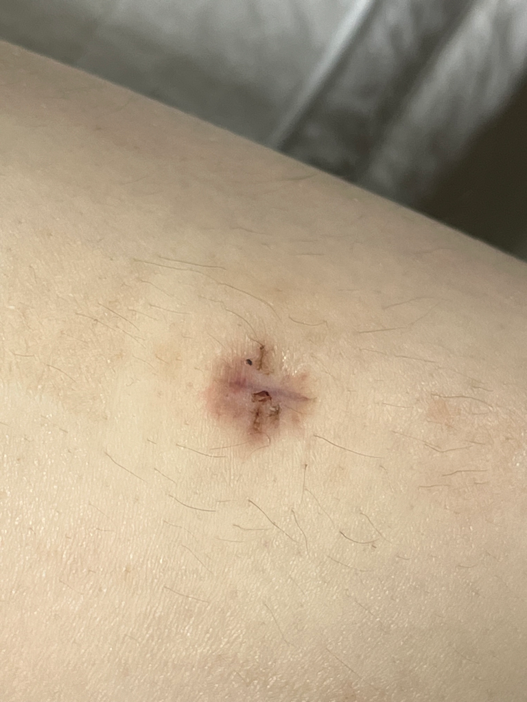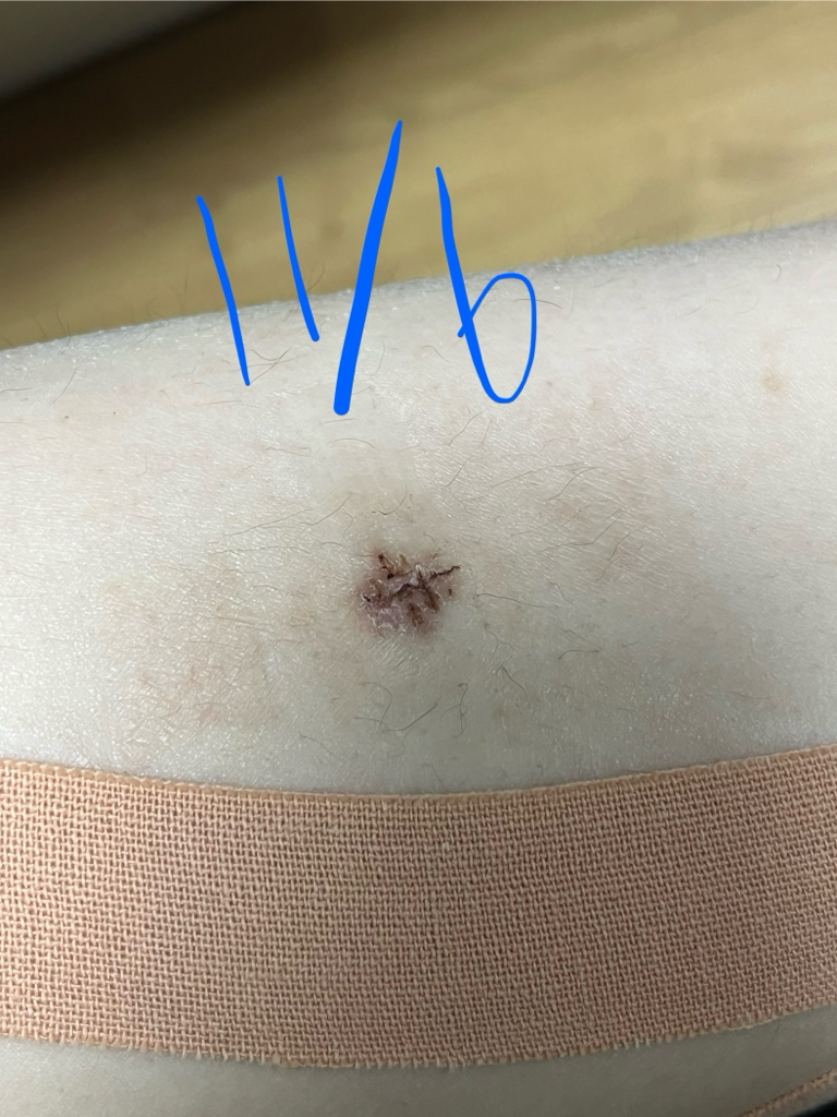 위, 아래 사진의 차이는 딱지가 떨어져나간 것 외엔 없습니다. 지금처럼 흉터연고 바르며 지내시면 되겠습니다.