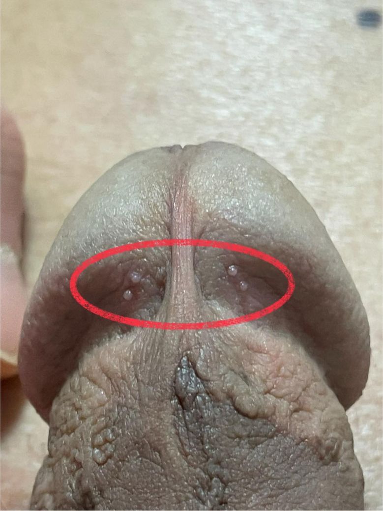 수포성 병변이 있는 것으로 보아 헤르페스의 가능성을 고려해볼 수 있긴 하겠습니다만, 대칭적으로 양측에 두 개 씩만 있는 비특이적인 양상의 소견으로 보입니다. 사진의 소견만 놓고 구체적으로 무엇인지 어떠한 병변인지 파악하고 감별하는 것은 아쉽지만 가능하지 않습니다. 비뇨의학과 진료 및 검진을 통하여 자세하게 파악해보고 감별해보시는 것이 필요할 것으로 사료됩니다.