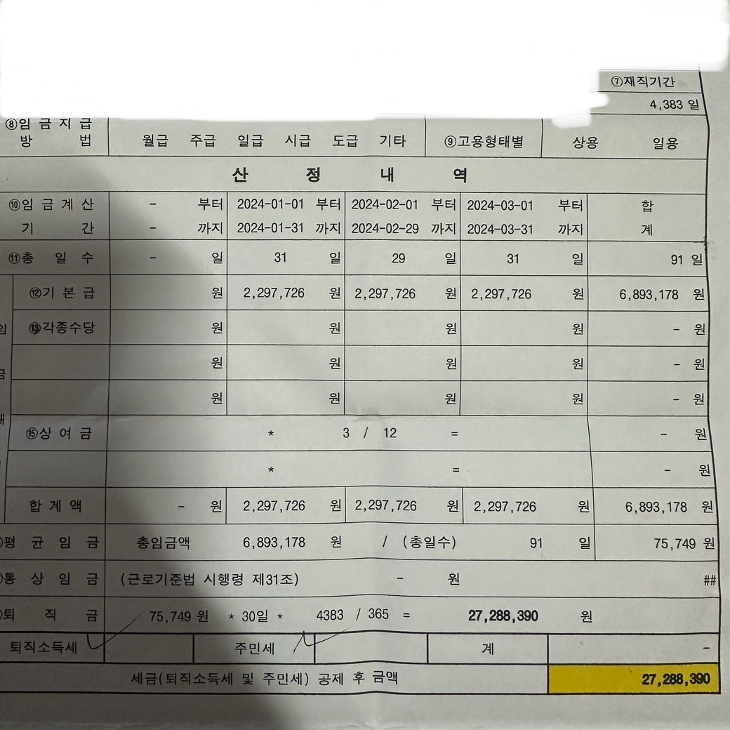 퇴직금 산정결과를 받아왔는데 맞는 계산인지 모르겠습니다