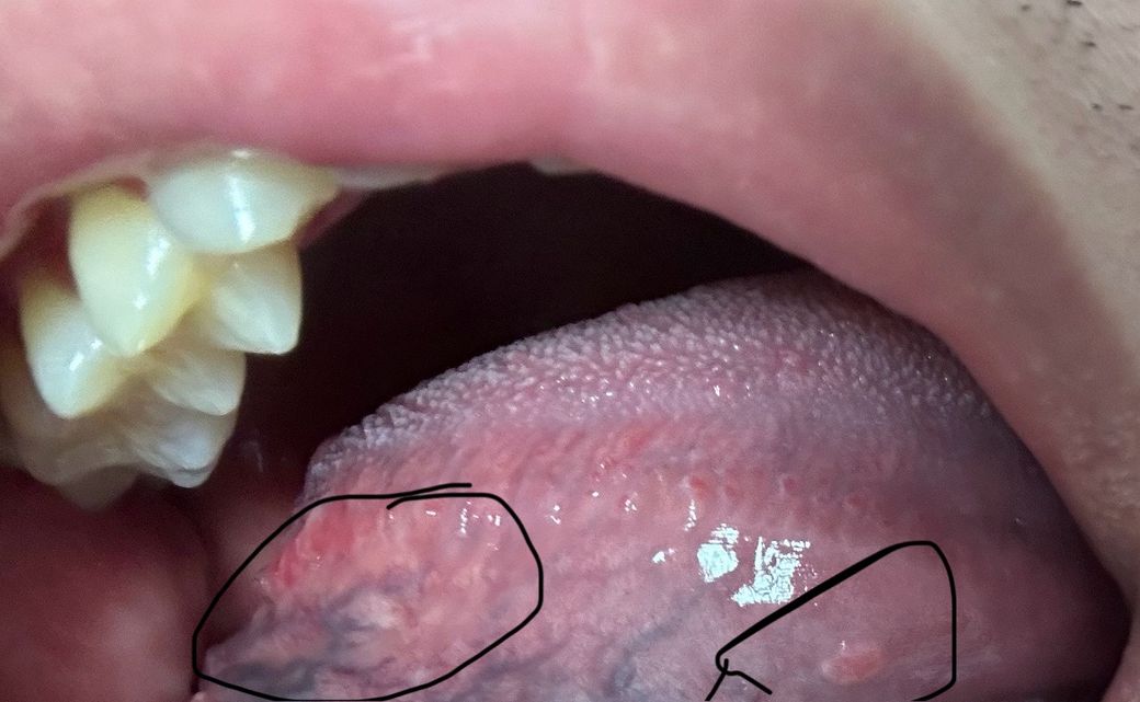 혀 우측 측면인데요, 왼쪽 동그라미 보면 중앙에 하얀색으로 된 부분이 있고 오른쪽 아래에는 혹같은게 나있어요 둘다 1cm 정도되고 생긴지 오래됐는데 없어지지않아요. 요즘 갑자기 걱정되어서 질문 남깁니다. 어제 이비인후과를 가서 왼쪽에 대해 여쭤봤는데 잘 안보인다 모르겠다 하셔서 질문 남깁니다 ㅠ