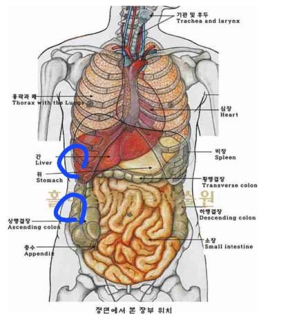 특히 위에 표시한 갈비뼈 쪽 부위는 무언가 들어찬듯한 묵직한 느낌이 지속되다 찌릿한 통증이 오고, 조직이 미세하게 경련하는 느낌이 자주 옵니다.