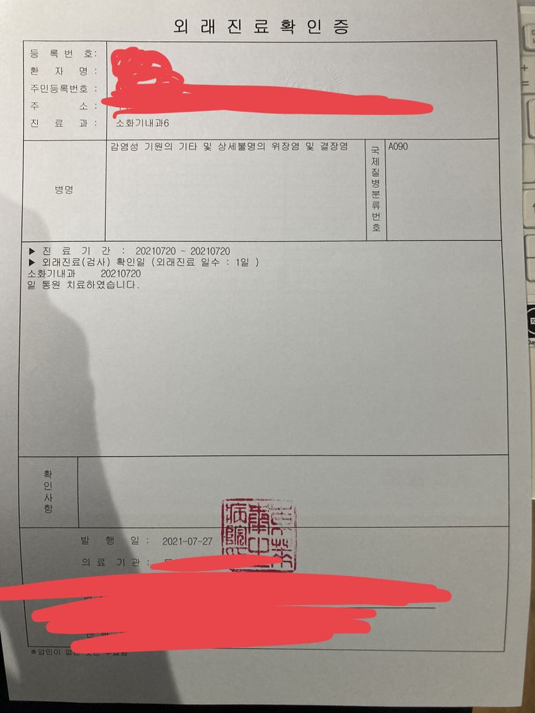 한달 전쯤 한 가게에서 식중독에 걸려 서류를 떼게 되었습니다
