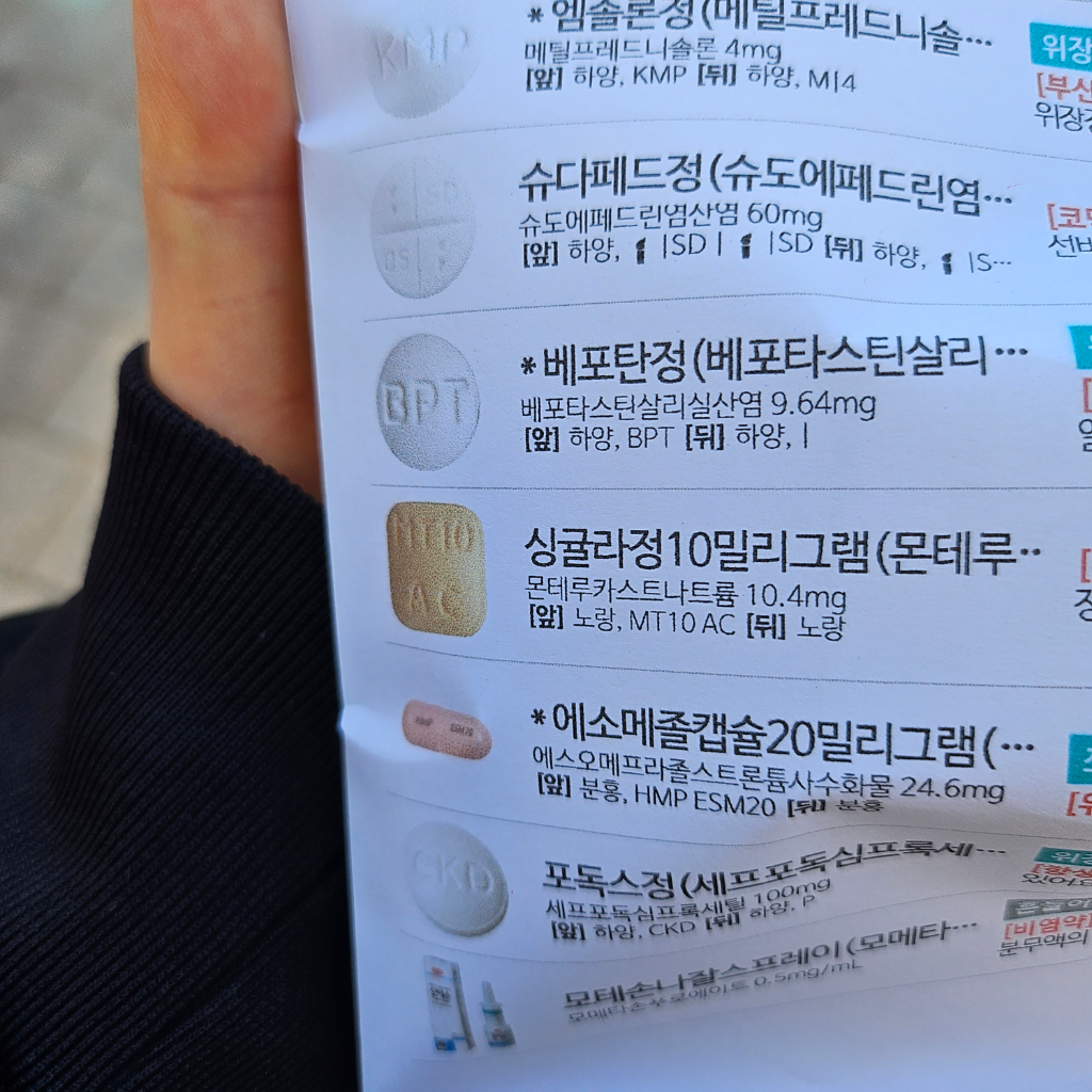 엠솔론정, 슈다페드정, 베포탄정, 싱귤라정10mg, 에소메졸캡슐 20mg, 포독스정 처방 받았습니다.